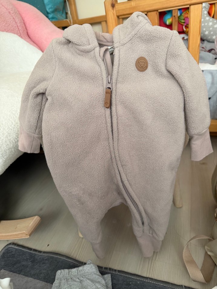 Yumuşak ve sıcak gri renkli, kapüşonlu ve fermuarlı bebek tulumu, rahat tutan kumaştan üretilmiştir.