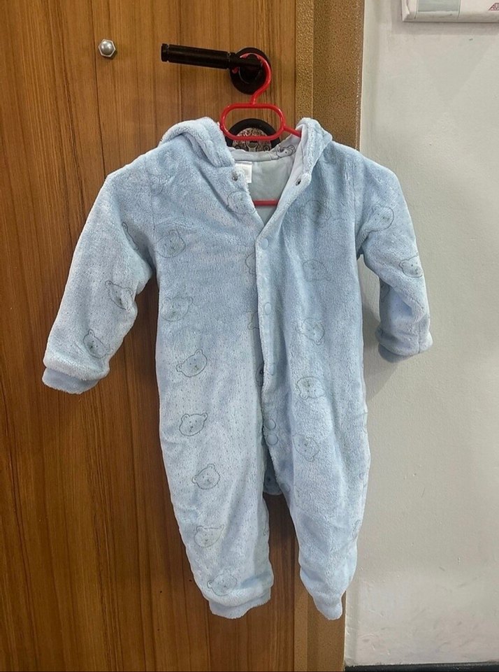Yumuşak ve sıcak gri bebek tulumu, düğmeli ve kapüşonludur. Rahat bir kumaştan yapılmış, desensiz sade tasarıma sahiptir. ❄️