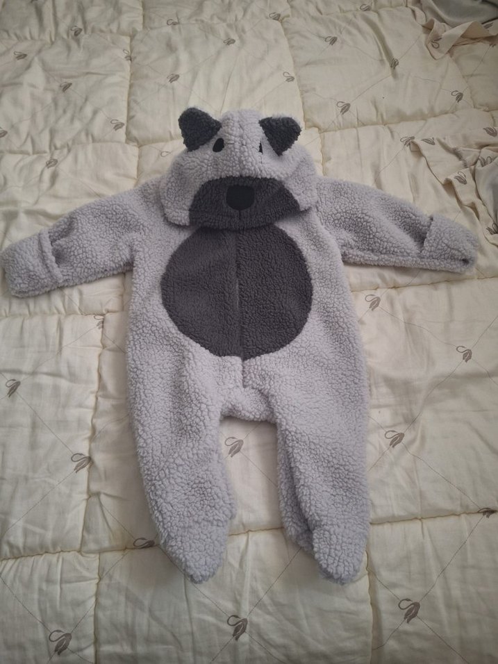Gri renkte, yumuşak ve sıcak kumaştan yapılmış, kapüşonunda kulak ve yüz detaylı kürklü bebek tulumu. Tam koruma sağlar. sıfır üründür hiç kullanılmadı.