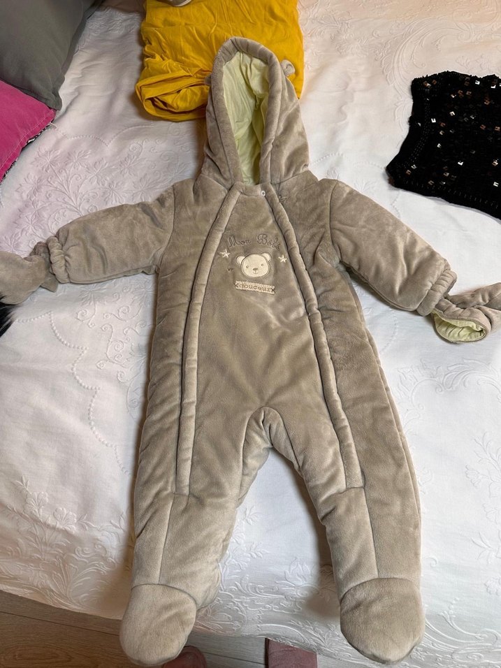 Gri renkli, yumuşak tüylü kumaştan yapılmış, kapüşonlu ve kürk detaylı bebek tulumu. Sokak stiline uygun, desensiz tasarıma sahiptir. ❄️ az kullanıldı. marka temsilidir