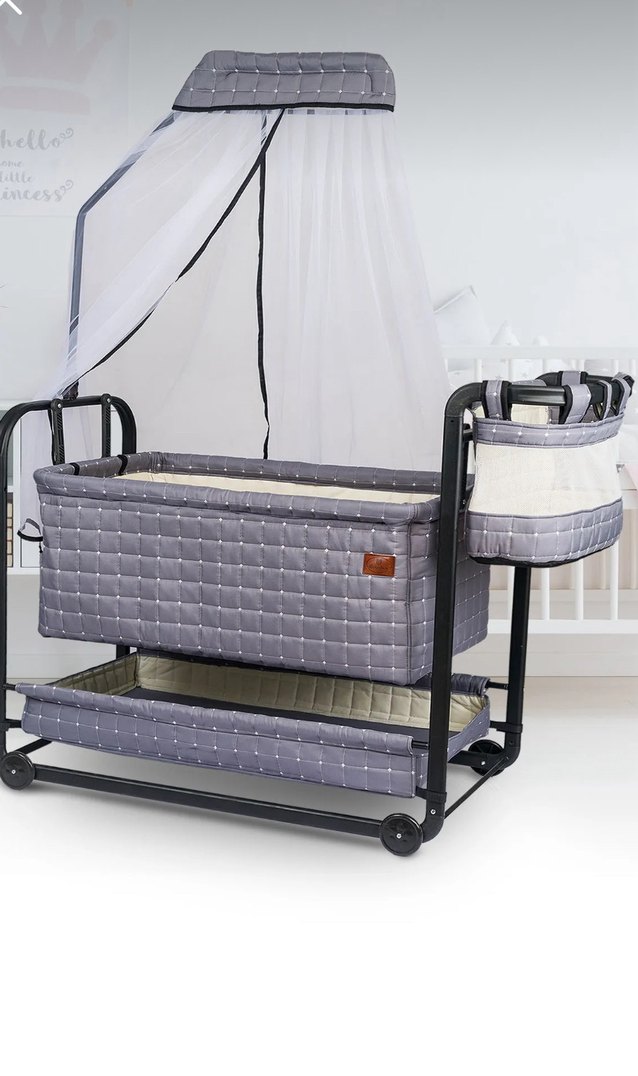 Kapitone desenli gri bebek beşiği ve sepet seti, sağlam çerçeve ve kolay hareket için tekerlekli. Yanındaki çantası hariç her şey aynısı sıfır sorunsuz