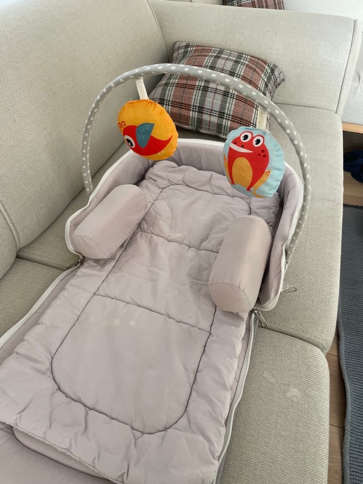 Yumuşak gri kumaşlı, yanları dolgulu bebek yatağı. İki asılı peluş oyuncak içerir. Taşınabilir ve konforlu. Yeni çok az kullanıldı.
