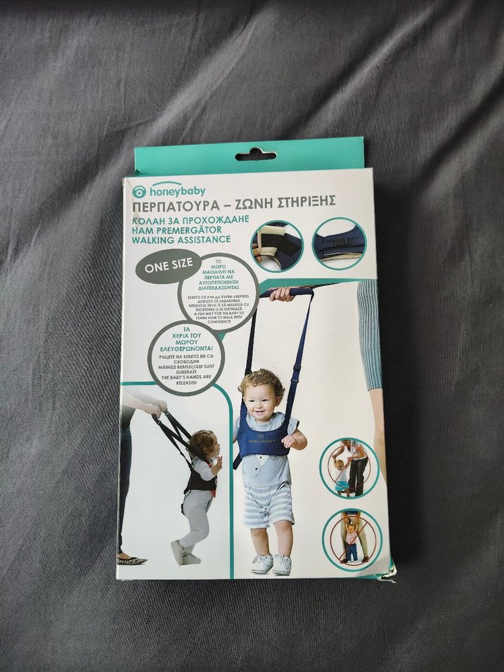 Ayarlanabilir askılı gri bebek yürüme destek askısı, küçük çocukların güvenle yürümelerine yardımcı olur. Tek beden. sıfır ayarında hediye geldi denemek için bir kere giydirdim sadece geç gelen bir hediyeydi yürümeyi öğrenmişti hemen hemen