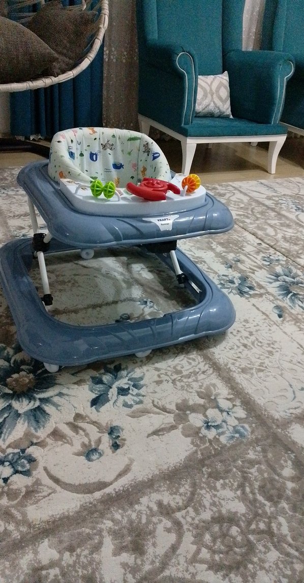 Gri bebek yürüteci, renkli hayvan desenli yumuşak oturma yeri ve oyuncaklı tepsi ile bebeğin ilgisini çeker.