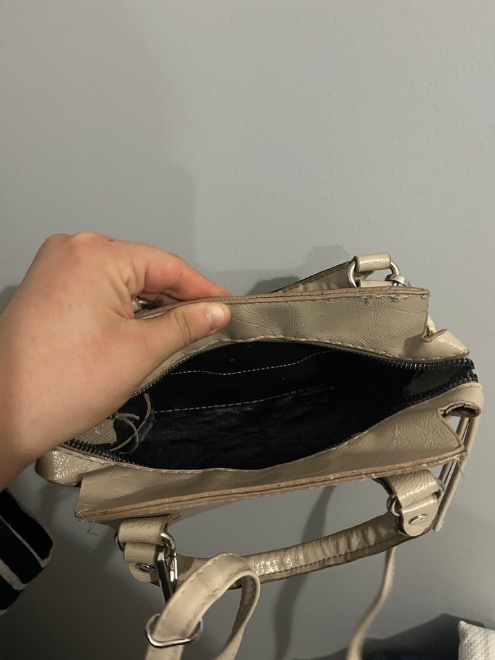 Gri tonlu bej deri, fermuarlı bölmeleri olan sade ve desensiz kadın çantasıdır. Günlük sokak stiline uygundur.