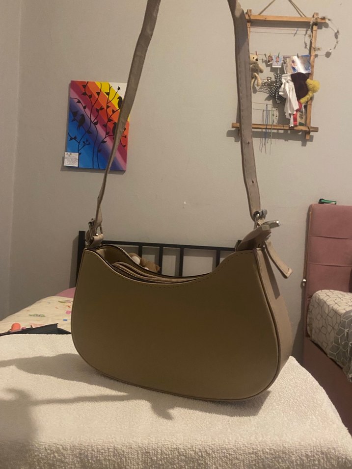 Bej ve gri tonlarında yumuşak deri, tokalı askı ve baskılı detaylara sahip kadın omuz çantası, günlük sokak stili için uygundur.
