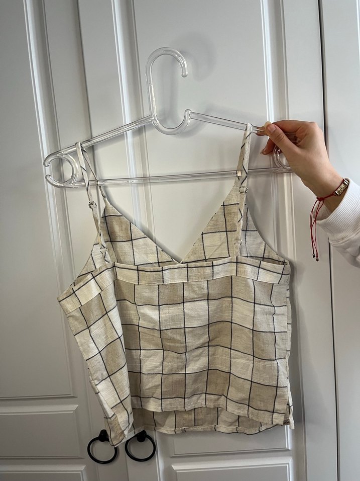 İnce askılı, bej ve gri ekose desenli hafif ve yumuşak kumaştan askılı bluz.