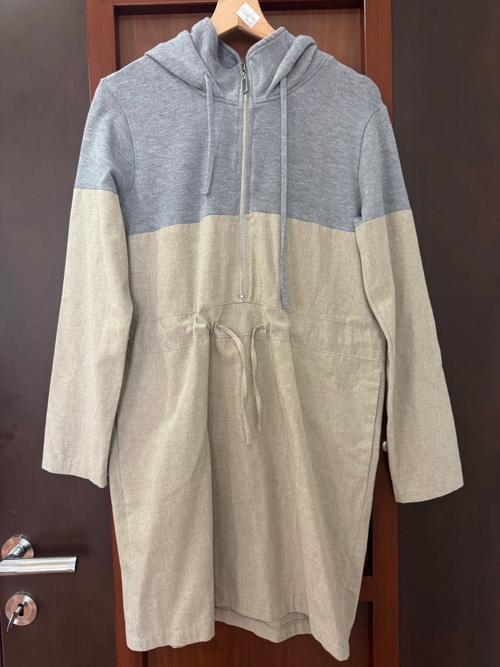 Gri ve bej renklerin birleşimiyle, kapüşonlu ve fermuarlı elbise , Uzun kollu ve yüksek yakalı, günlük kullanıma uygun.
