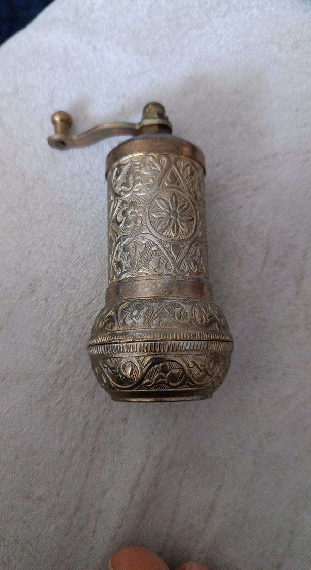 İşlemeli çiçek desenli metal baharat öğütücü, elde çevrilen kolu ile kullanımı kolaydır. Gri ve bej tonlarında vintage görünümlü. Antika çalışır durumda
