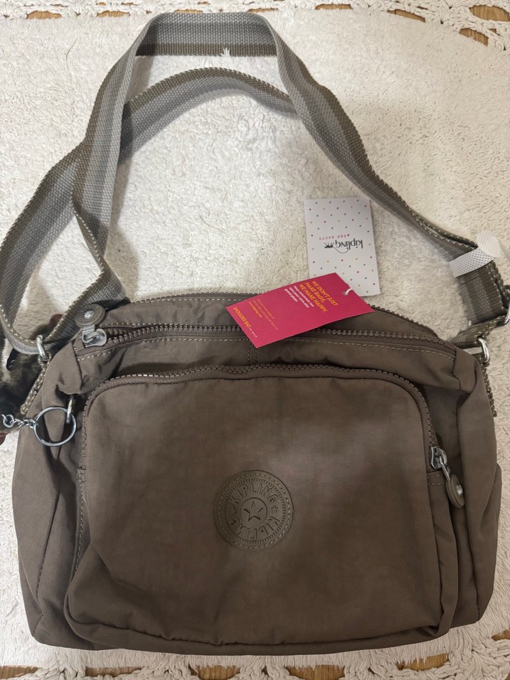 Gri ve bej renklerde, çok gözlü fermuarlı kadın çapraz askılı çanta, dayanıklı sentetik kumaştan, günlük sokak tarzı için uygun. Orjinaldir, hiç kullanılmamıştır.