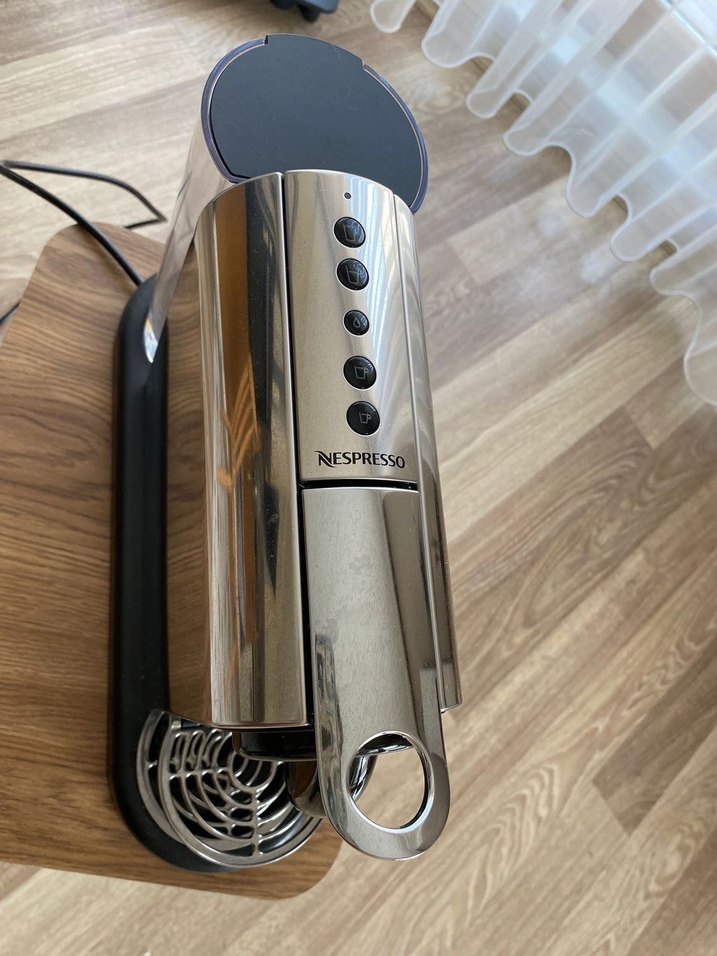 Gri ve bej renklerde Nespresso kahve makinesi, kullanımı kolay düğmelerle pratik kahve yapma imkanı sunar. Kompakt ve şık tasarıma sahiptir. ☕