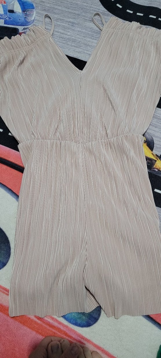 Gri bej renkte, pilili sentetik kumaştan yapılmış, V yakalı ve askılı kollu, rahat kesim midi uzunlukta kadın tulumu.