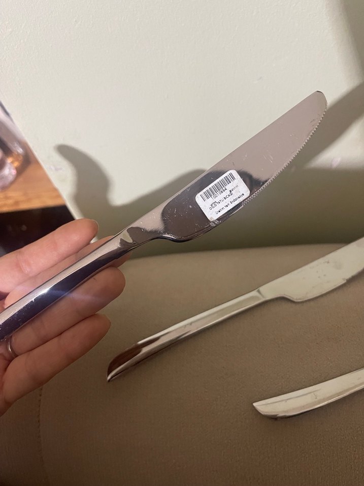 Keskin dişli uca ve şık gri-bej renkte kulpa sahip kesici bıçak.