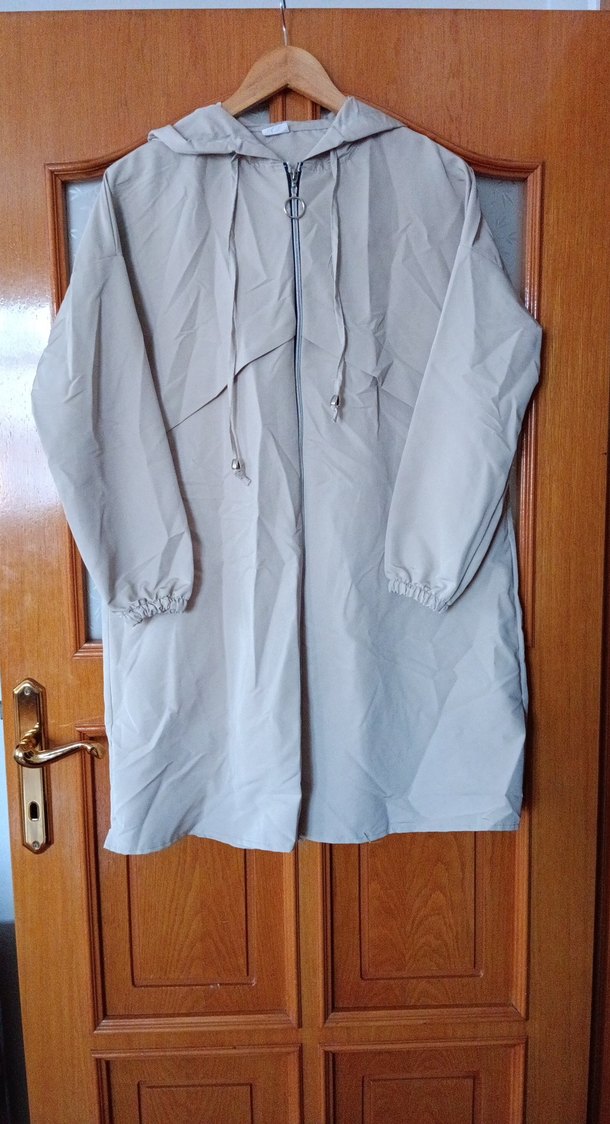 Bej-gri renkli paraşüt kumaştan, kapüşonlu, uzun kollu, bol kesim kadın ceket. Drapeli kapüşon, lastikli manşetler ve ön fermuar detaylarına sahiptir. Minimalist ve günlük stil için uygundur.