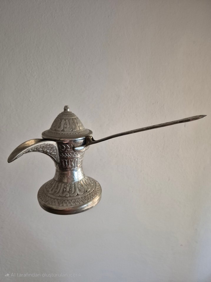 Uzun saplı, gri ve bej tonlarında işlemeli vintage cezve. ☕