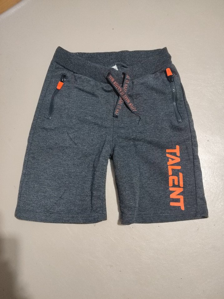 Gri renkli, bel bantlı ve bol kesim şort. Yanında 'TALENT' baskısı bulunur, rahat ve sokak stili için uygun.