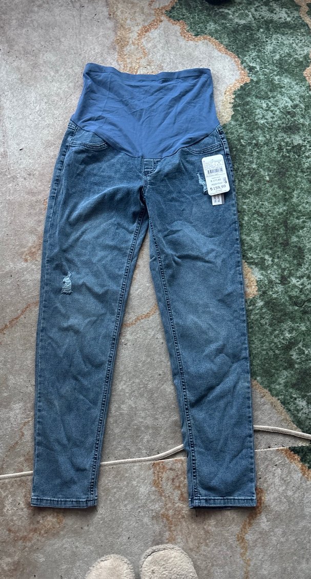 Gri renk, bel bantlı rahat kesim hamile kot pantolon. Günlük sokak stiline uygun, dış mekan kullanımı için ideal.
