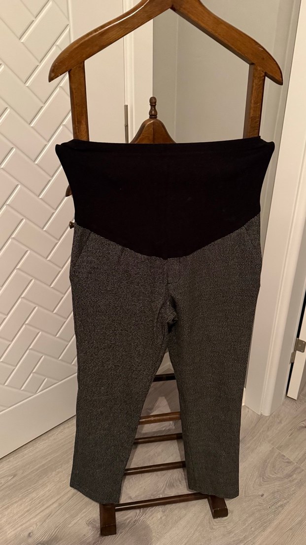 Gri renkte, bel bantlı ve normal boyda, yumuşak sentetik kumaştan yapılmış, ofis için uygun hamile pantolonu.