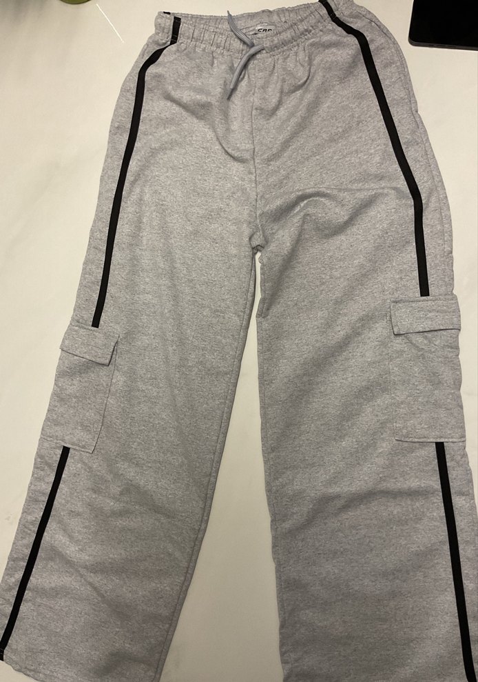 Gri renkte, bel bantlı ve siyah yan şeritli bol kesim kadın eşofman altı. Yumuşak ve sıcak kumaştan, midi boyda, cepli outdoor kullanıma uygun. ️