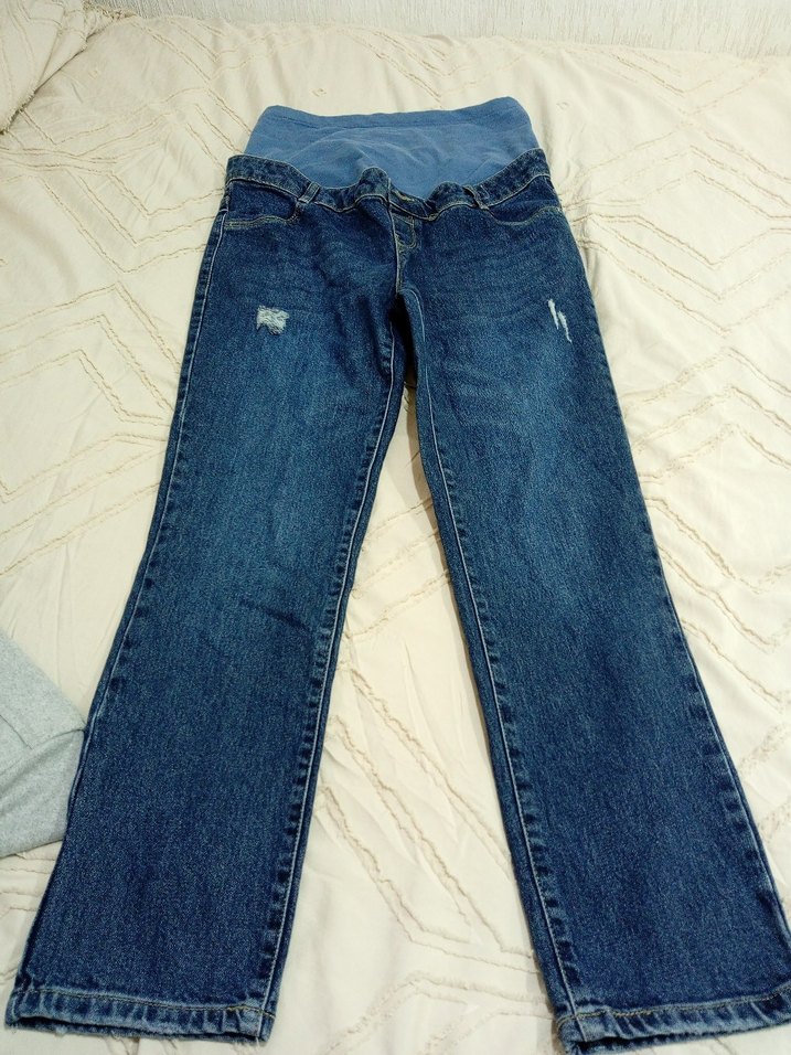 Gri esnek bel bantlı, mavi denim hamile pantolonu. Rahatlık için bol kesim ve normal boyda, günlük kullanıma uygun.
