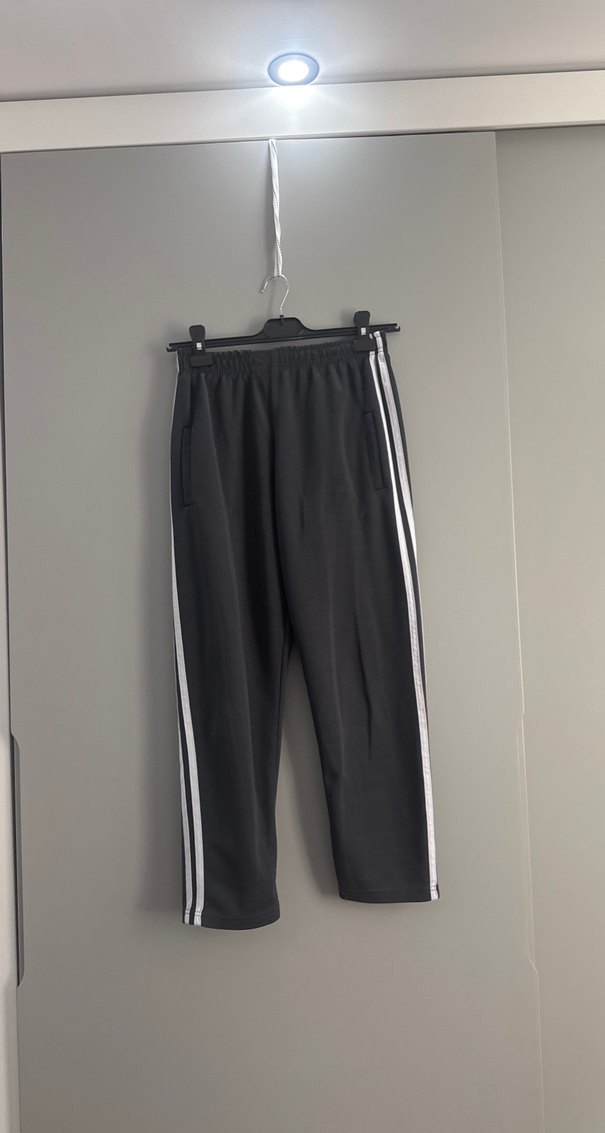 Gri, bel bantlı, yan şeritli, yumuşak kumaştan rahat kesim erkek eşofman altı. Spor ve sokak tarzına uygun. ♂️