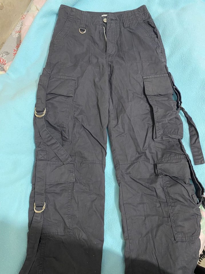 Gri renkli, bel detaylı ve çok cepli gevşek kesim kot pantolon. Midi boyda, sokak tarzı ve rahat dış mekan kullanımı için uygun.