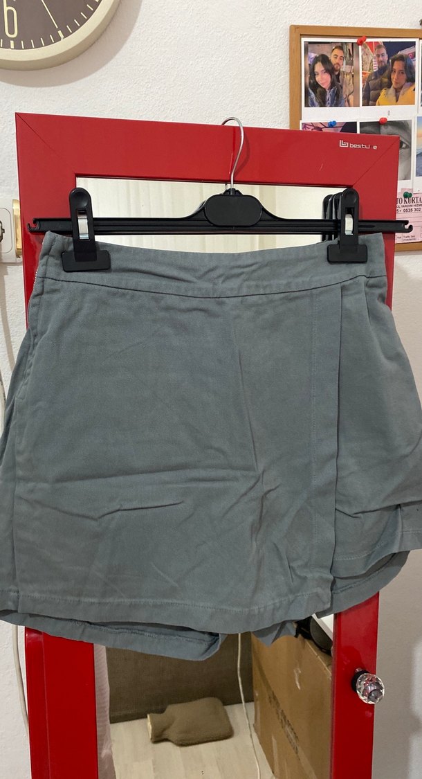 Gri renkli, bel detaylı, bol kesim hamile mini şort. Günlük kullanım için rahat ve şık sokak stili parçası.
