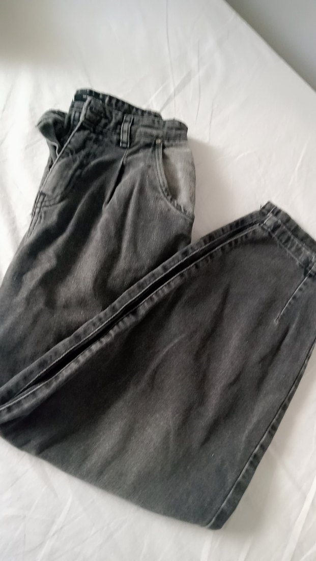 Gri renkte, bol kesim ve bel detaylı kadın jean. Midi boyda, gündelik kullanıma uygun rahat bir sokak stili sunar.