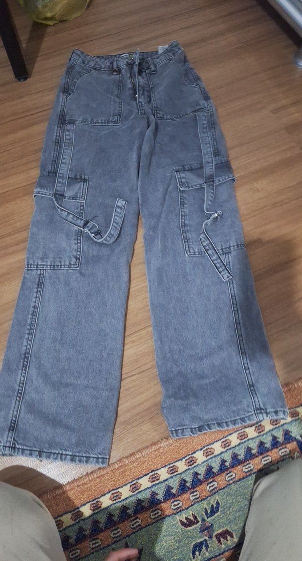 Gri renkte, bol kesim ve midi boy kadın kot pantolon. Belinde kemer detayı vardır ve desen içermez. Rahat sokak stili için uygun. Paçalarında görselde görüldüğü gibi yıpranma var, onun dışında sorunu yok.