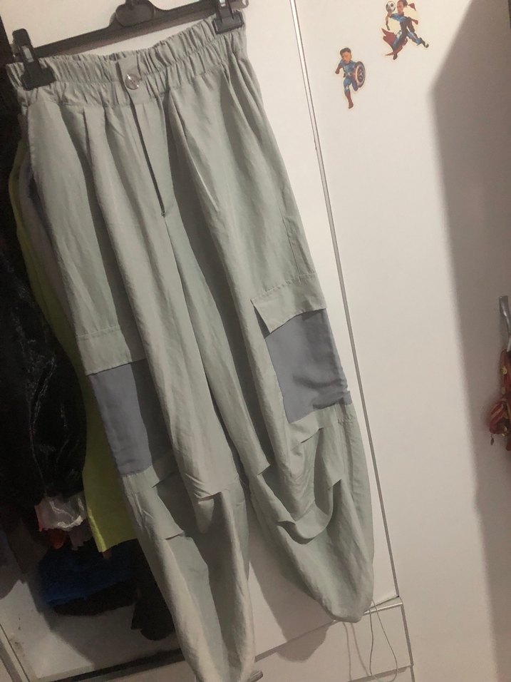 Gri renkte, bel detaylı, sentetik kumaşlı, rahat kesim midi kadın pantolon. Sokak stili athleisure görünümüne uygun, günlük dış mekan kullanımı için idealdir.