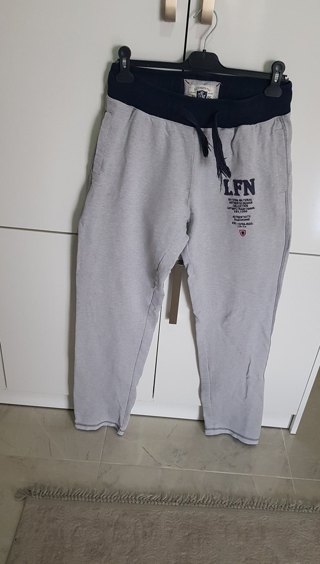 Gri pamuklu, belden bağlamalı, bol kesim kadın eşofman altı. Midi boy ve spor sokak tarzı için uygun, üzerinde 'LFN' baskısı bulunur. ♀️