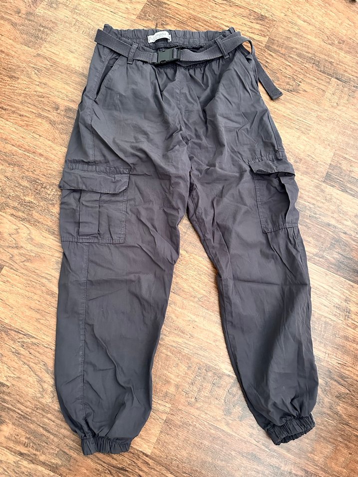 Gri renkte, kemerli ve bol kesim kadın kumaş pantolon. Sokak modasına uygun, midi boy ve cepli yapıda, sentetik kumaştan üretilmiştir.