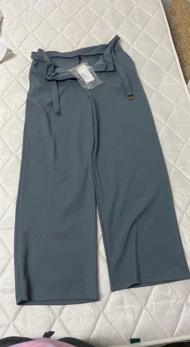 Gri renkte, beli kemerli ve midi boy rahat kesim kadın pantolon. Sentetik kumaştan üretilmiş, günlük dış mekan kullanımı için uygundur.
