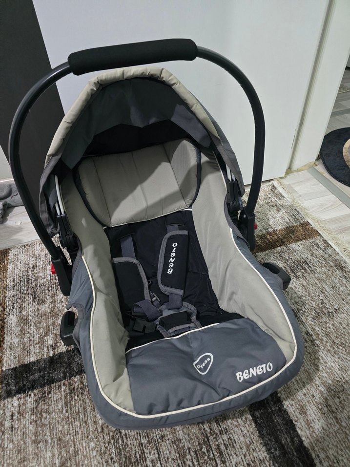 Gri renkli Beneto bebek oto koltuğu, yumuşak iç döşemeye ve güvenli emniyet kemerlerine sahiptir. Taşıma kolu ile kolay taşınabilir.