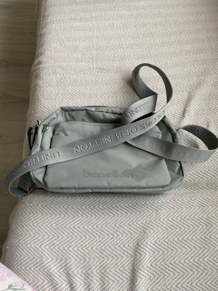 Benetton marka açık mavi bel çantası, sentetik kumaştan üretilmiş, günlük kullanım ve streetwear için uygun, kemer detaylıdır.