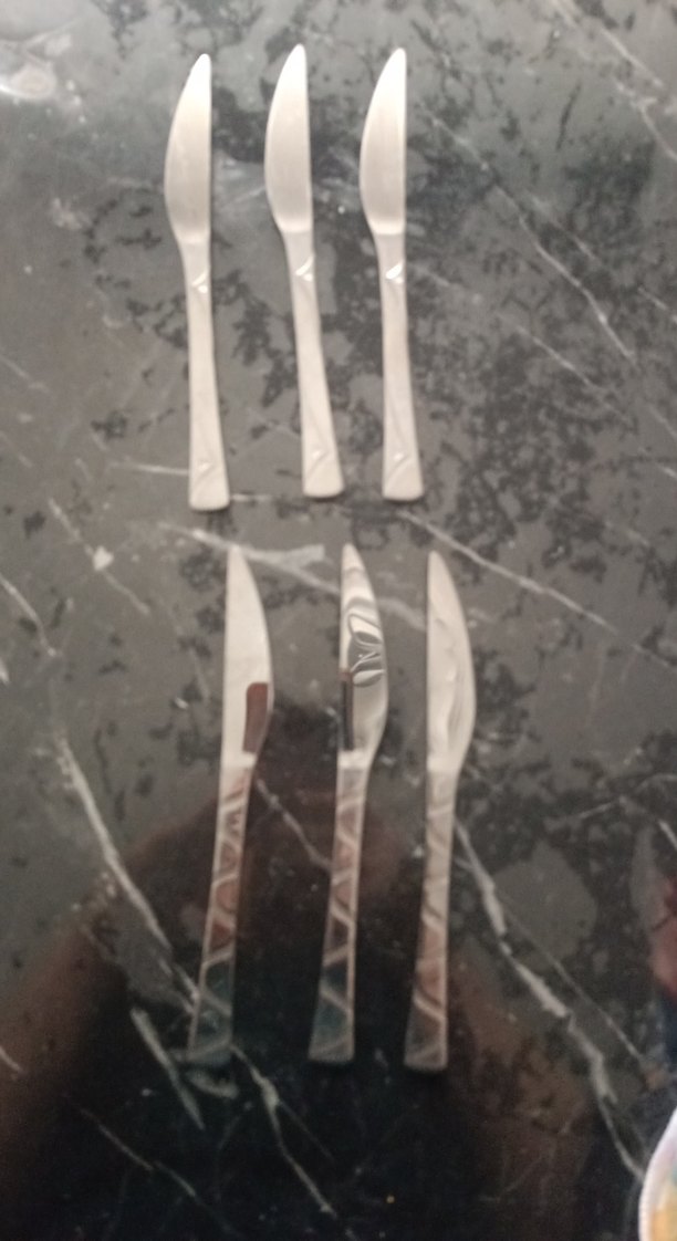 Gri ve beyaz renkte, üç bıçak ve üç çatal olmak üzere toplam altı parça çatal bıçak seti.