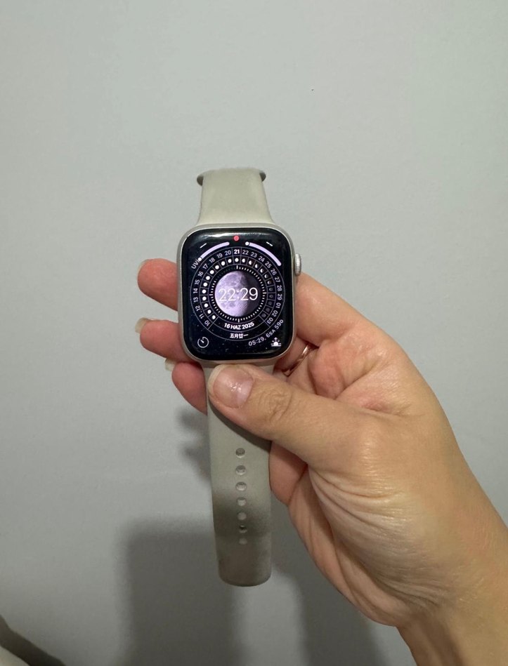 Bu akıllı saat gri kayış ve beyaz çerçeveye sahiptir. Ekranda birden çok fonksiyon gösteren dijital dairesel ekran vardır. ⌚8 45 mm
