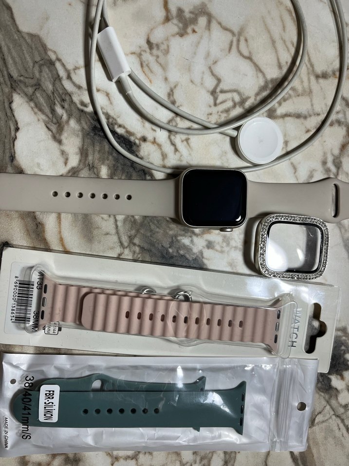 Gri ve beyaz renklerde akıllı saat, şarj cihazı, koruyucu kılıf ve pembe ile yeşil renklerde iki ekstra kayış içerir.⌚ orijinal magazından aldim bir sorunu yok pek kullanmadim resimdeki bütün tam aksesuarları ile göndereceğim Beşiktaş içi elden verebilirim Apple Watch se 40 mm garantisi bitti