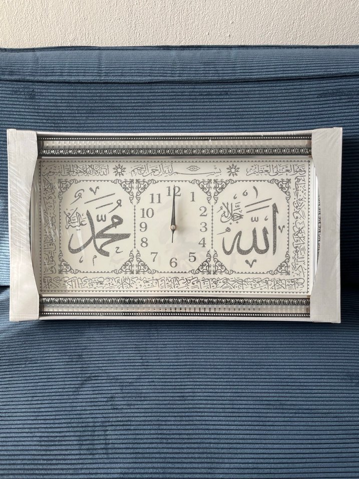 Gri ve beyaz renklerde, Allah ve Muhammed yazılı Arapça hat süslemeli, dikdörtgen çerçeveli dekoratif duvar saati. Siyah rakamlı kolay okunur kadran. Ürün paketi hiç açılmadı sıfır üründür.