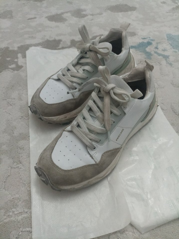 Gri ve beyaz renklerde, bağcıklı ve kauçuk tabanlı kadın spor ayakkabısı. İnce topuklu ve günlük sokak stili için uygundur.
