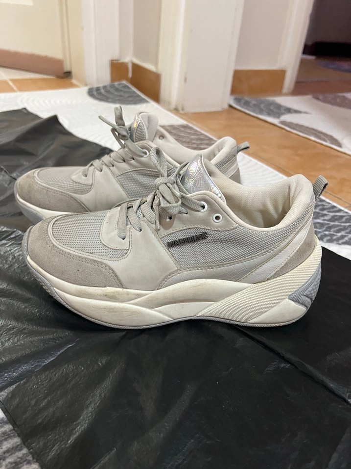 Gri ve beyaz renklerde, bağcıklı ve platform topuklu kadın spor ayakkabısı. Kauçuk tabanlı, spor ve sokak tarzına uygun.