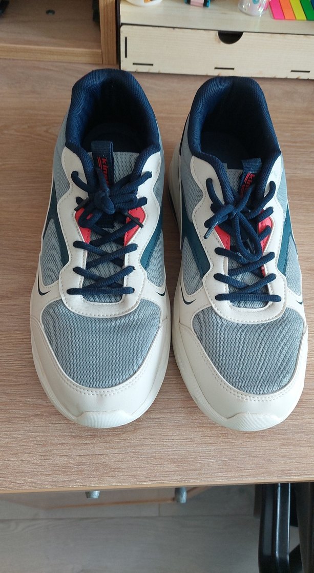 Gri ve beyaz renkte, bağcıklı, kauçuk tabanlı, nefes alabilen üst yüzeye sahip spor ayakkabıdır. ♂️
