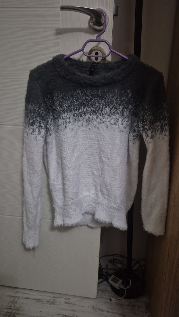 yumuşacık uzun kollu, yuvarlak yakalı kadın kazak, yumuşak triko kumaştan, gri ve beyaz bağlama desenli, rahat ve salaş kesimle günlük kullanıma uygun.