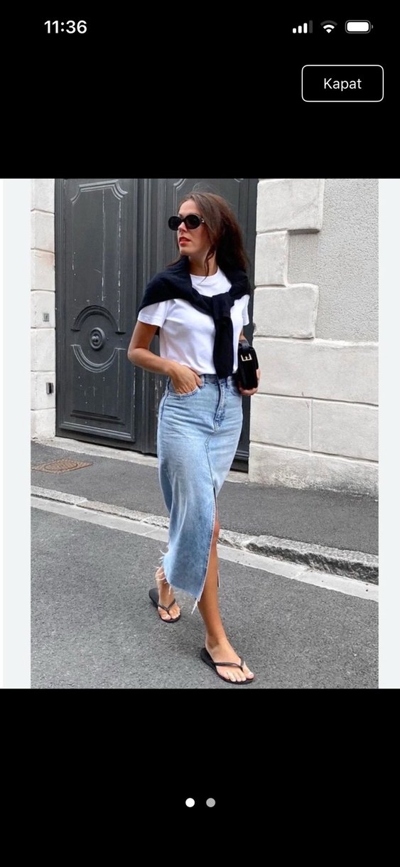 Gri Beyaz Batik Desenli Midi Denim Etek