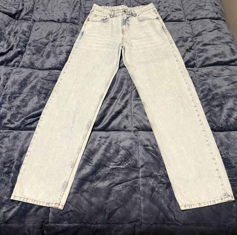 Gri ve beyaz batik desenli, normal boy, regular fit Erkek kot pantolon, günlük rahat kullanım için uygun.
