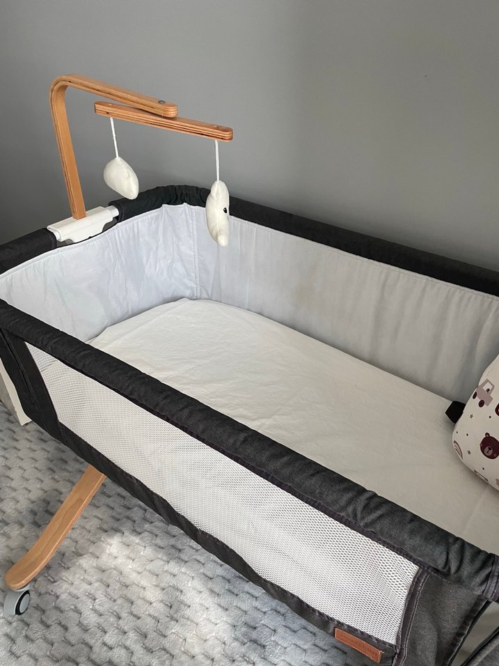 Yumuşak kumaş kenarlıklı, havadar file panelli gri-beyaz bebek beşiği. Ahşap kolunda iki asılı oyuncak bulunur. Rahat ve sade tasarım.