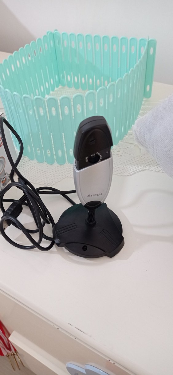 Ayarlanabilir açılı, sabit tabanlı gri beyaz bilgisayar kamerası. Kablolu bağlantı ile güvenilir kullanım sağlar.