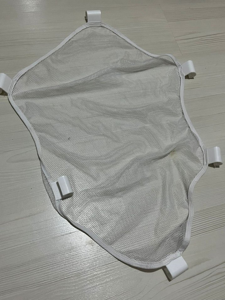Gri ve beyaz renkte, bağlama halkalı nefes alabilir örgü bebek taşıma ağı. Hafif ve havadar kumaş konfor sağlar.