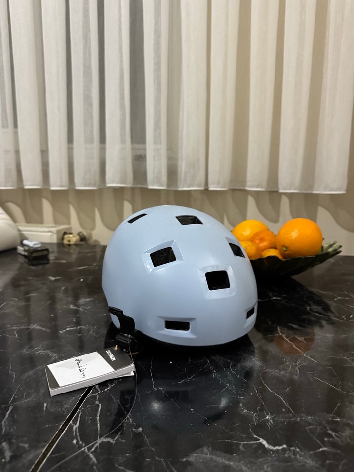 Plastik malzemeden gri beyaz biker motosiklet kaskı, Velcro kayışlı, sokak tarzı ve rock punk havasında.