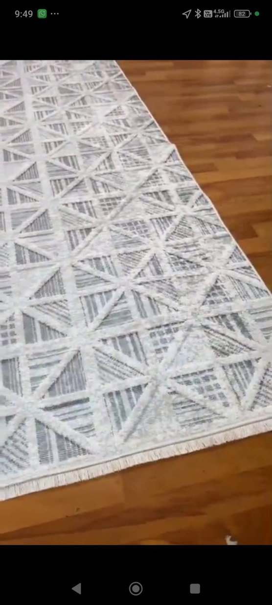 Gri ve beyaz renklerin hakim olduğu çağdaş tarzda, geometrik dokulu desensiz halı. Modern bir dokunuş sağlar.